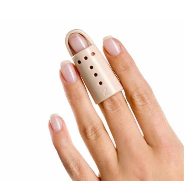 - Protects and supports distal joint of finger in extension while permitting unrestricted movement of finger digit closest to the hand