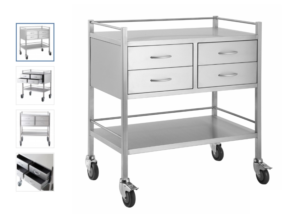 • A high grade double four drawer stainless steel trolley. Has top and bottom side rails and lockable castors for safety.