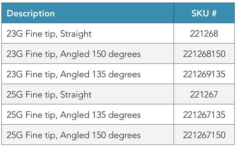 Tip options include beveled, blunt, fine, and tapered blunt or fine to provide support for many ophthalmic surgical procedures and conditions.