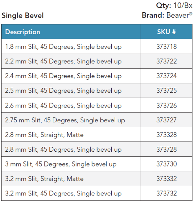 BVI offers a wide range of safety and conventional knives for cataract surgery. Beaver Slit, Sideport, Crescent and Micro-Sharp knives come in a wide range of sizes to meet the needs of ophthalmic surgeons.