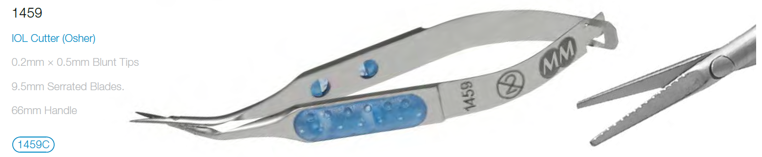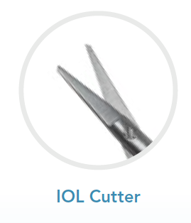 The blades of the IOL Cutter scissors are narrow and provide ease of entry through the incision. Serrations in the blade allow secure cutting without excessive movement.