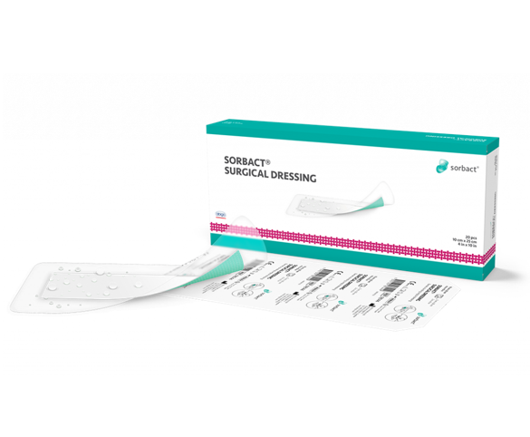Sorbact® Surgical Dressing is a sterile, bacteria and fungi binding wound dressing. It consists of a green Sorbact® wound contact layer combined with an absorbent wound pad and a transparent acrylic adhesive film. Sorbact® Surgical Dressing absorbs and retains exudate and enables a moist wound environment. The water proof backing film provides protection against external contamination and allows excess fluid to evaporate.