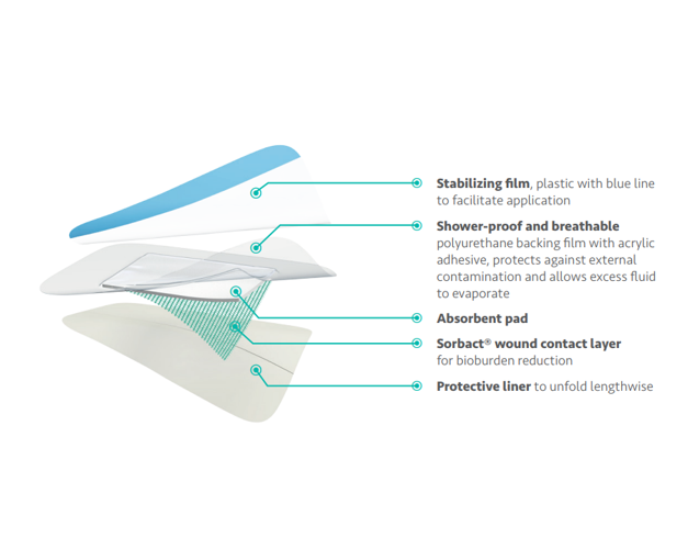 Sorbact® Surgical Dressing is a sterile, bacteria and fungi binding wound dressing. It consists of a green Sorbact® wound contact layer combined with an absorbent wound pad and a transparent acrylic adhesive film. Sorbact® Surgical Dressing absorbs and retains exudate and enables a moist wound environment. The water proof backing film provides protection against external contamination and allows excess fluid to evaporate.